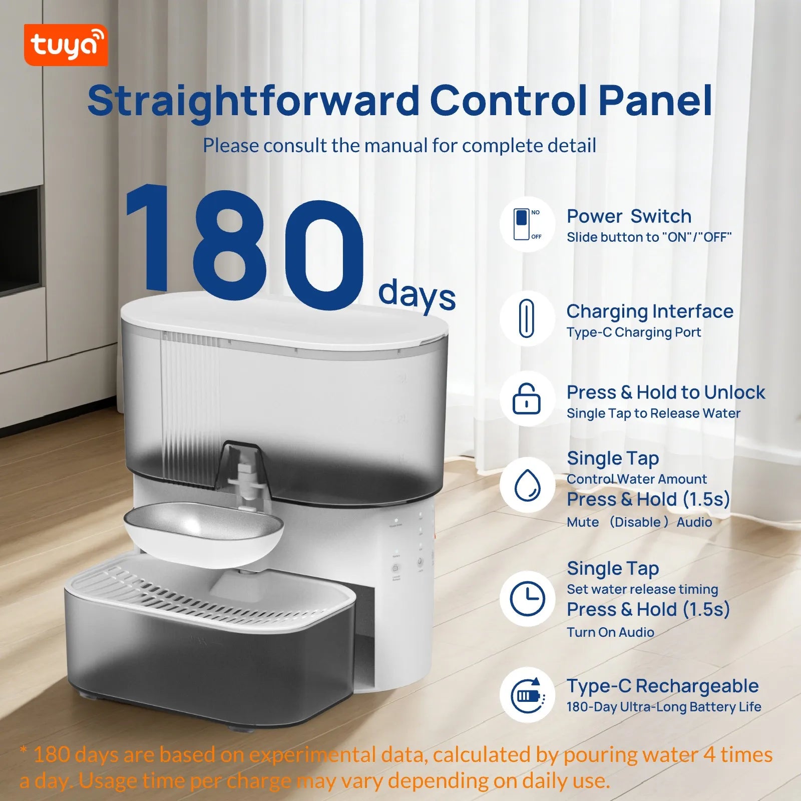 3.180 Days Cordless Freedom – Powered by a 2,000mAh USB-C rechargeable battery, this fountain runs cordlessly for up to 6 months per full charge. The 3L clean-water tank lasts 3–9 days, ideal for homes, balconies, or travel. Keep pets hydrated effortlessly, even when you’re away